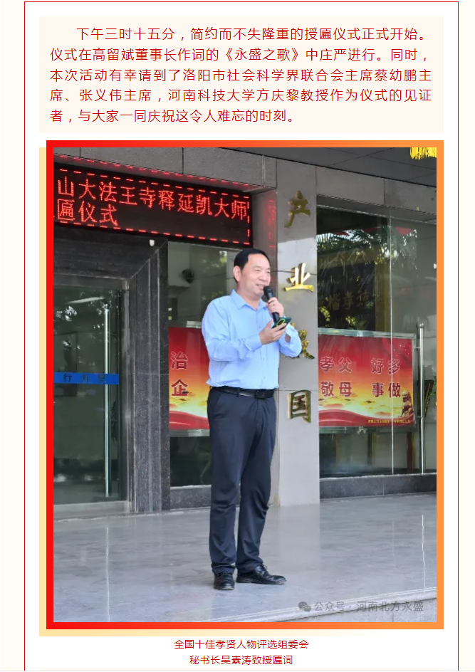 全国十佳孝贤人物评选组委会和中国登封嵩山大法王寺释延凯大师向北方永盛董事长高留斌授匾仪式